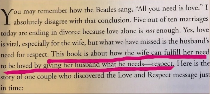 He says love and respect are not the same thing; you respect your boss, for instance, but you don’t love your boss. (68). So the way we treat our boss is analagous to the way we should treat our husbands–we should do what they say.