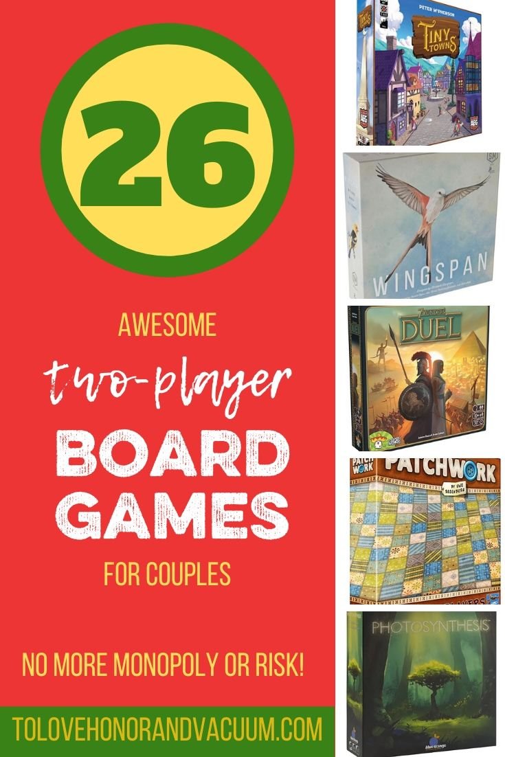 When we were first married, most of the two-player board games that were around were the traditional ones–Monopoly, Risk, Scrabble, Boggle. Monopoly can be a dangerous game, because it tends to be quite vicious and cut-throat. And Risk just takes FOREVER, and can get vicious, too. And Scrabble? You just have to be really good at words, and often only one of you is (I’ll share my favourite Scrabble replacements below!).