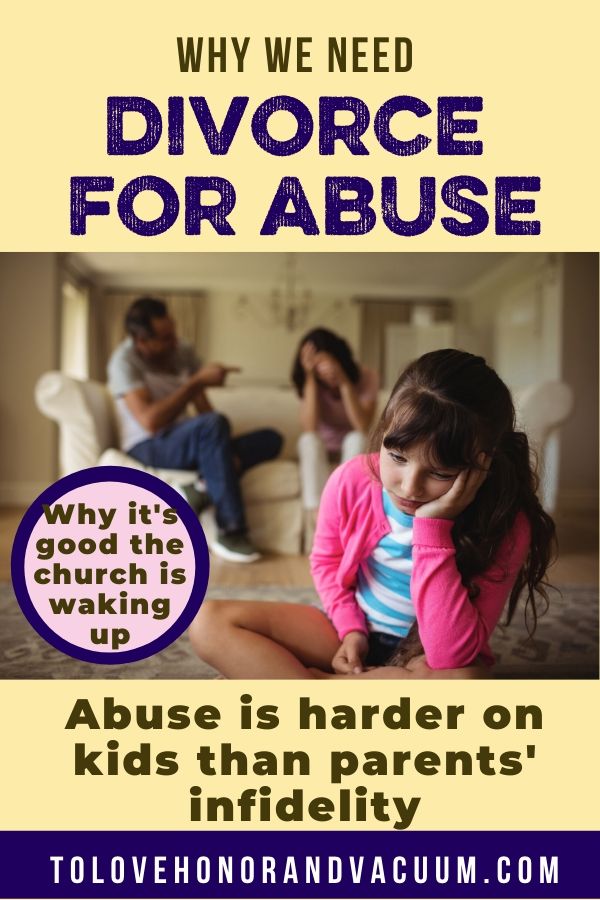 But the bigger issue I want to raise here is that, for the children in the marriage, abuse–whether emotional or physical–is far worse than adultery. And yet for years, the church has been treating it as the other way around. And I would add that a child witnessing a mother being abused is as harmful to that child as being abused him or herself. After all, really want to torture someone? Make them watch someone else being hurt. And this applies whether it’s emotional abuse or physical abuse.