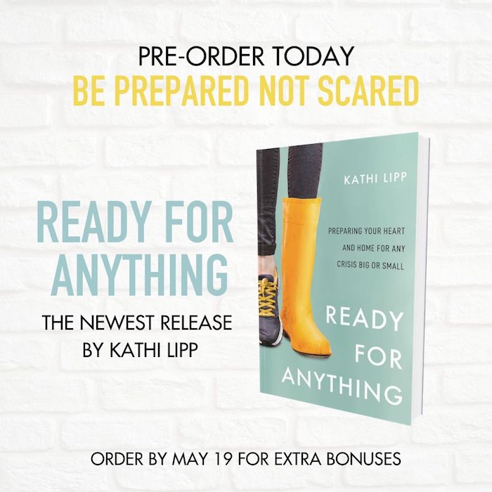 Do you want to be prepared for any crisis to come in the future? See Kathi Lipp’s timely book Ready for Anything; Preparing Your Home for Any Crisis Big or Small When you order before May 19th, you’ll also receive a free e-course download of Kickstart to Clutter Free, and the ebooks Cooking During a Crisis, and the 5-Day Family Curriculum for Crisis Preparation. Get these offers, and other resources at Kathi’s website.