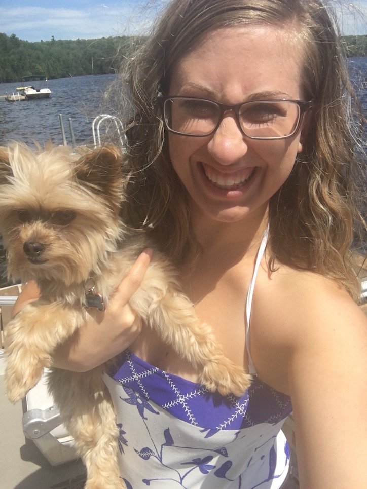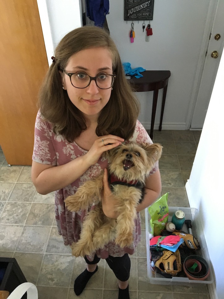 It’s fully fenced and he can’t get out. So for the first time in years he’s able to go off leash outside, which is a BIG DEAL. (They were never able to take him to dog parks because he gets nervous around other dogs and tries to attack them, which isn’t good when you’re so tiny). And the dog LOVES chasing squirrels and scaring robins. Plus he loves sticking his nose into the neighbour’s yard and talking to the dog on the other side of the fence. Anyway, yesterday I walked over to Rebecca and Connor’s house to record the podcast we were going to put up today. Rebecca and I went for a quick walk with the dog and the baby to talk it all over first, and then we came home and got ready to record. The dog wanted to go outside, so we opened the back door and let him out– and three seconds later we heard the most terrible yelps. Rebecca ran outside to pick him up. It looked like he had fallen down the concrete stairs, but we couldn’t tell exactly what was wrong. But he was obviously in pain, and his lip was bleeding. They thought he had maybe dislocated his knee or his hip. So we called around and got an appointment at the vet. The dog was breathing funny and acting funny and everyone was very worried. And he’s an older dog who hasn’t been treated well most of his life, so he isn’t in amazing health. They were worried he was going to need surgery, but they didn’t want to have to make that decision, because they didn’t want to put him through pain that likely wouldn’t work (surgeries on small dogs are less successful). Here’s Rebecca with him right before Connor took him to the vet.