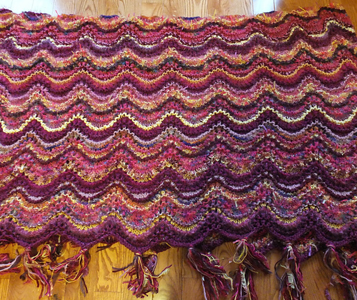 I was talking to my mother about why it is that I love patterns like this so much, and we both decided that it’s because I get real satisfaction from using up bits that other people would have discarded. I don’t like waste. But beyond that, I love creating something beautiful out of what no one else would have seen as lovely. I’ve made about 8 of these blankets (and give some as gifts) too, and most of them are made of yarns that look quite ugly by themselves, but work beautifully when you put them together.