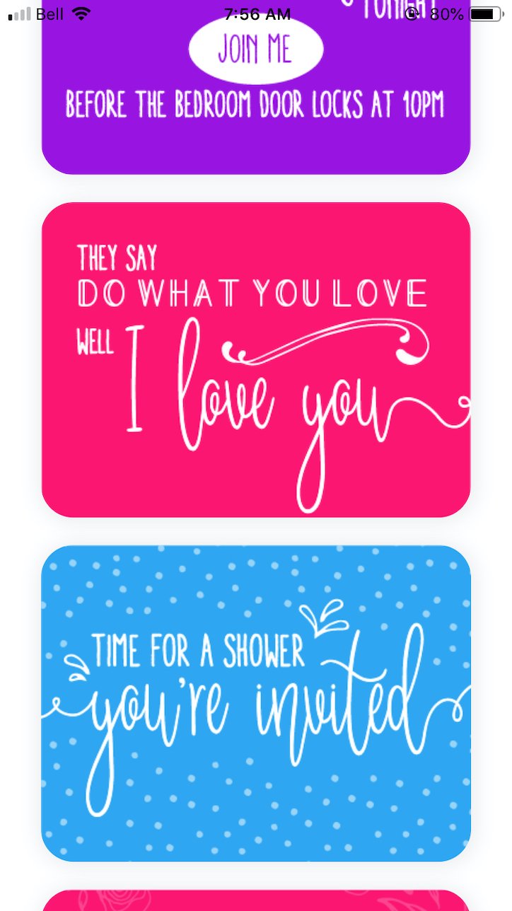 And you can build that confidence with other fun things, like Battlestrip, creating your own foreplay routine, or even sending sexy invite texts. They have a whole bunch of them, and you just choose one and message it to your spouse!